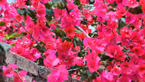 金龟古镇春意浓,簕杜鹃染粉墙头