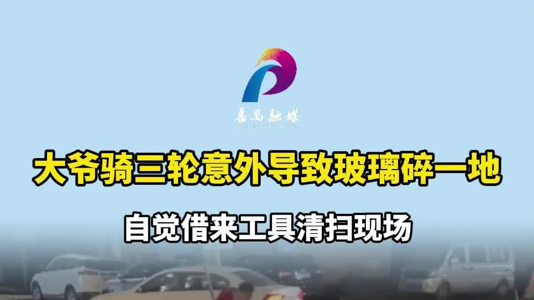 大爷骑三轮意外导致玻璃碎一地,自觉借来工具清扫现场