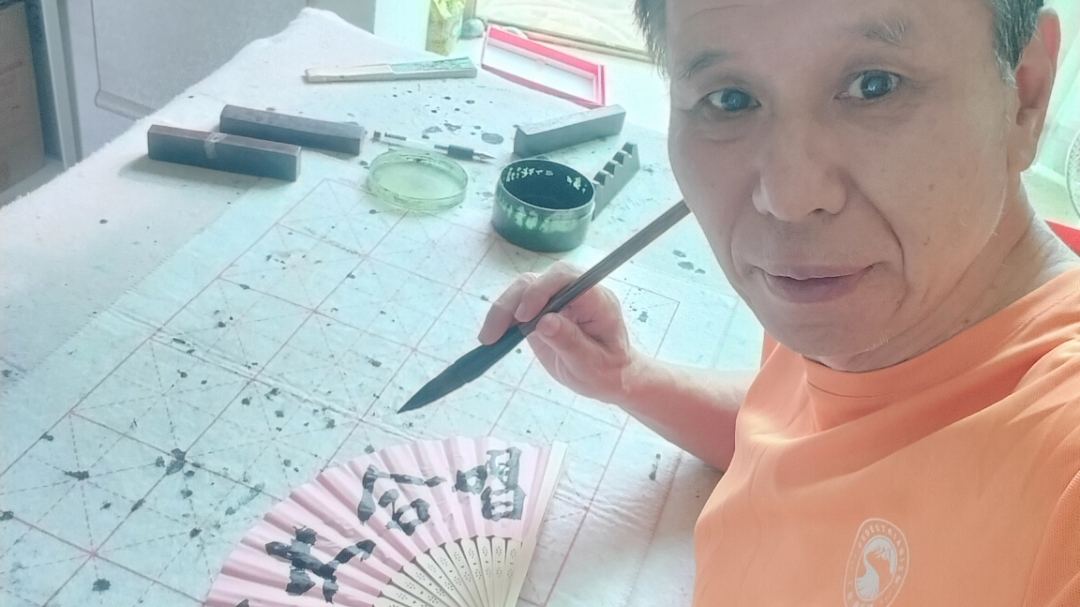 我的折扇书写“黄河大合唱”,配乐是我的手风琴演奏黄河大合