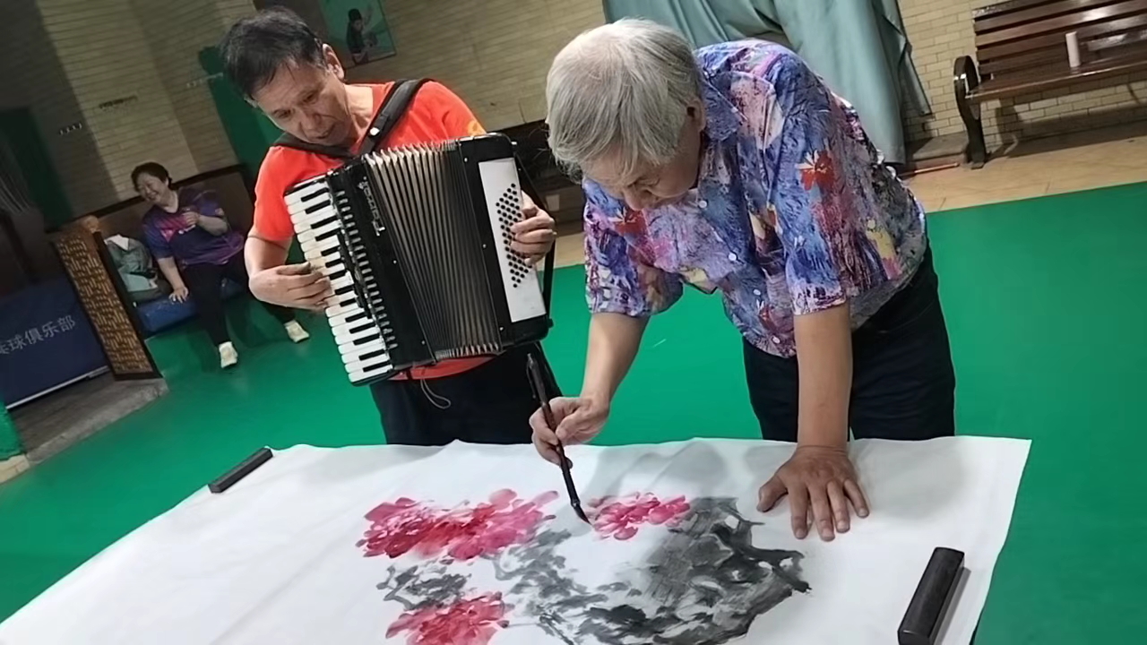 我手风琴伴奏华丽宫书画老师们演唱《我和我的祖国》。