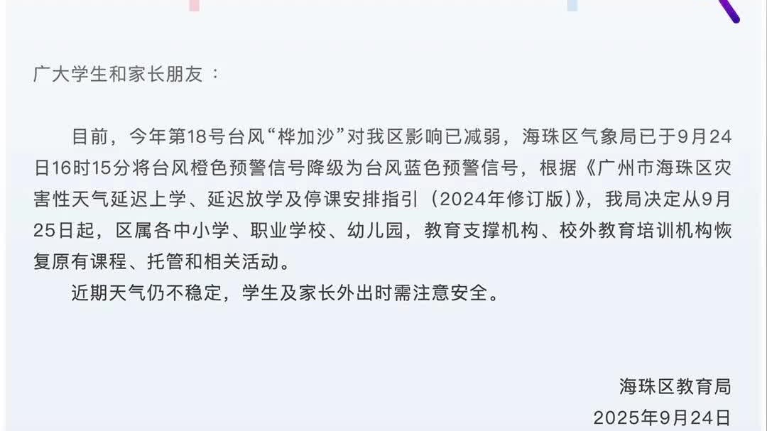 海珠区教育局:25号正常返校!已有学校通知今晚住宿生返校