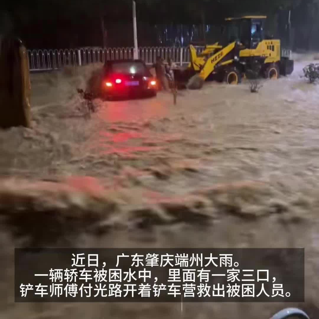 广东肇庆暴雨一轿车被困 ,“铲车侠”逆流而上成功营救