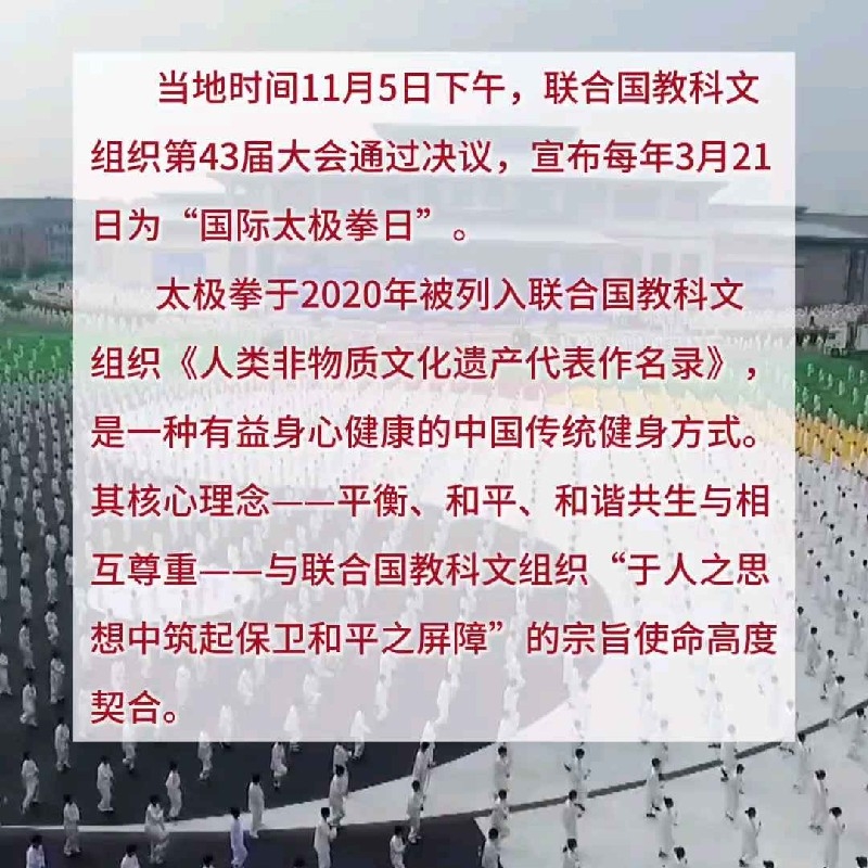联合国教科文组织将每年3月21日设立为“国际太极拳日”