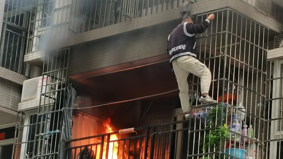广州天河一小区住宅突发火情,社区干部徒手攀防盗网救火