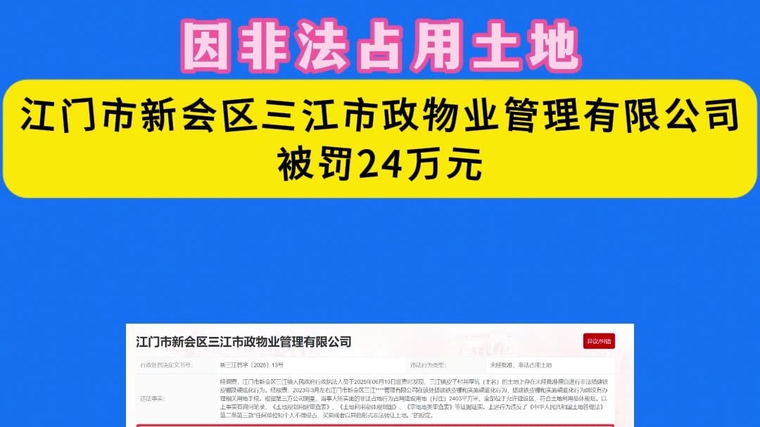 因非法占用土地,新会区三江市政物业公司被罚24万元