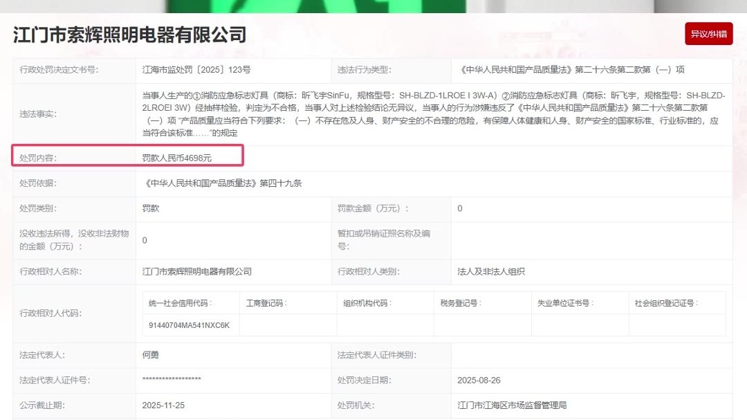 江门市索辉照明电器公司消防应急标志灯具抽检不合格被处罚