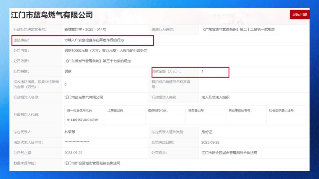 涉嫌入户安全检查弄虚作假,江门市蓝鸟燃气公司被罚款1万元
