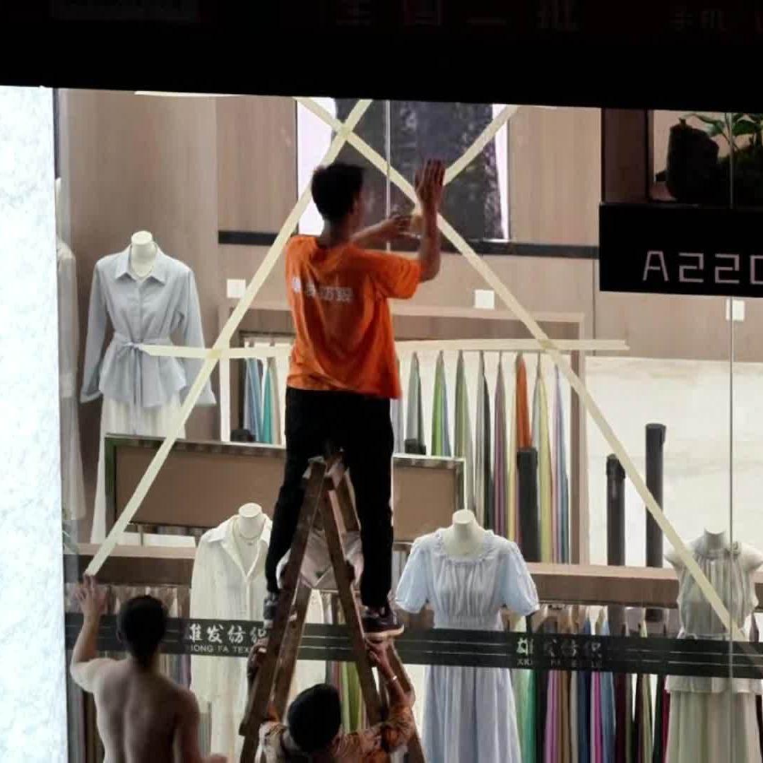 广州海珠区“中大门”服装城内,店铺工作人员给玻璃橱窗粘贴胶带