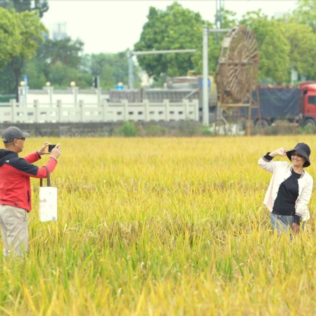 广州白云:晚稻喜迎丰收 市民游览“城市稻田”