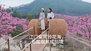 江门紫风铃花海,花盆点缀成仙镜。