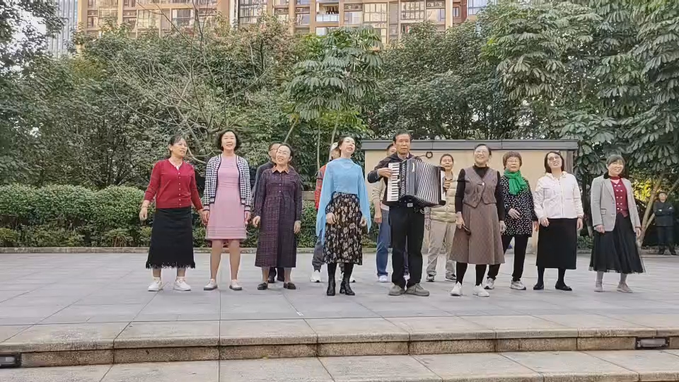 《五星红旗迎风飘扬》。我手风琴伴奏书法家李赐麟老师高歌。