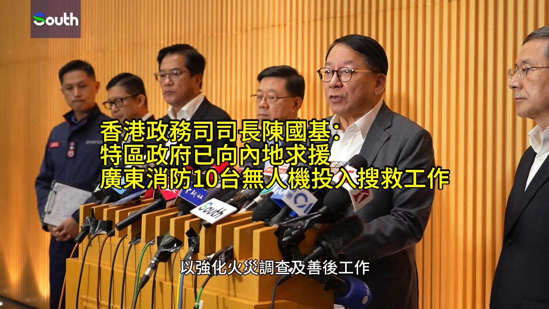 香港政务司司长陈国基:特区政府已向内地求援,广东消防10台无人机投入搜救工作