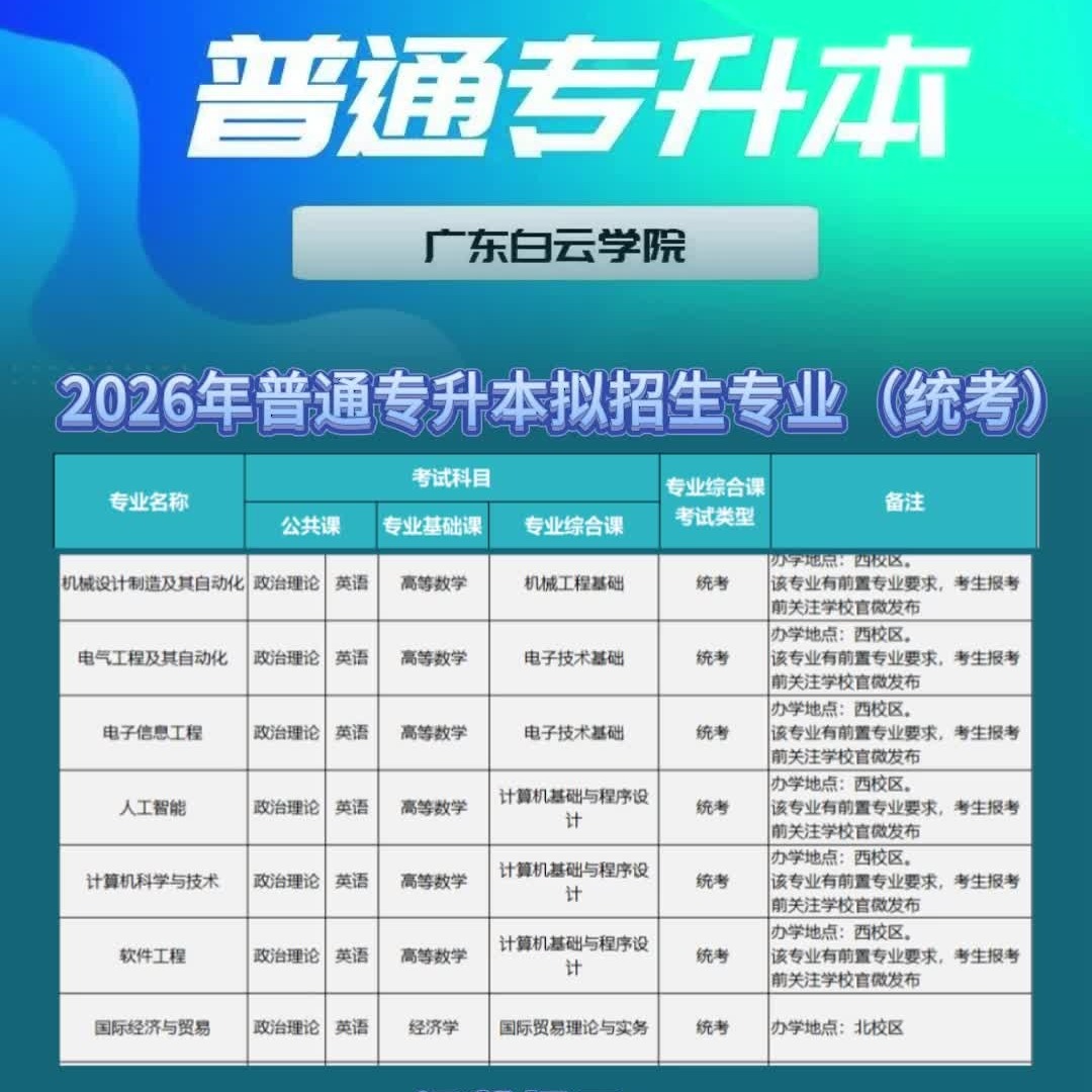 广东白云学院2026年普通专升本招生专业公布!