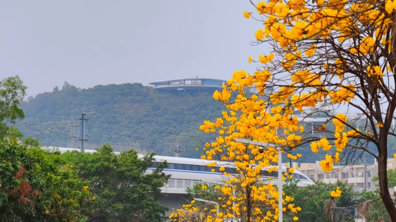 黄花风铃木、簕杜鹃与高铁共舞,科学公园观景台见证城市浪漫