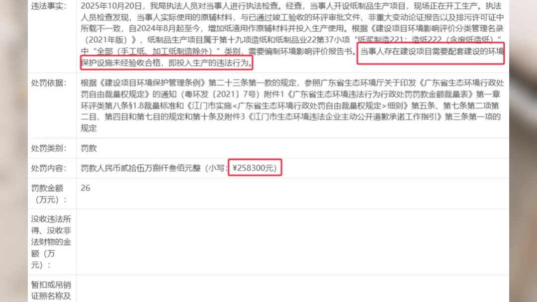 环境保护设施未经验收便投产!开平市东吉纸业被罚26万元