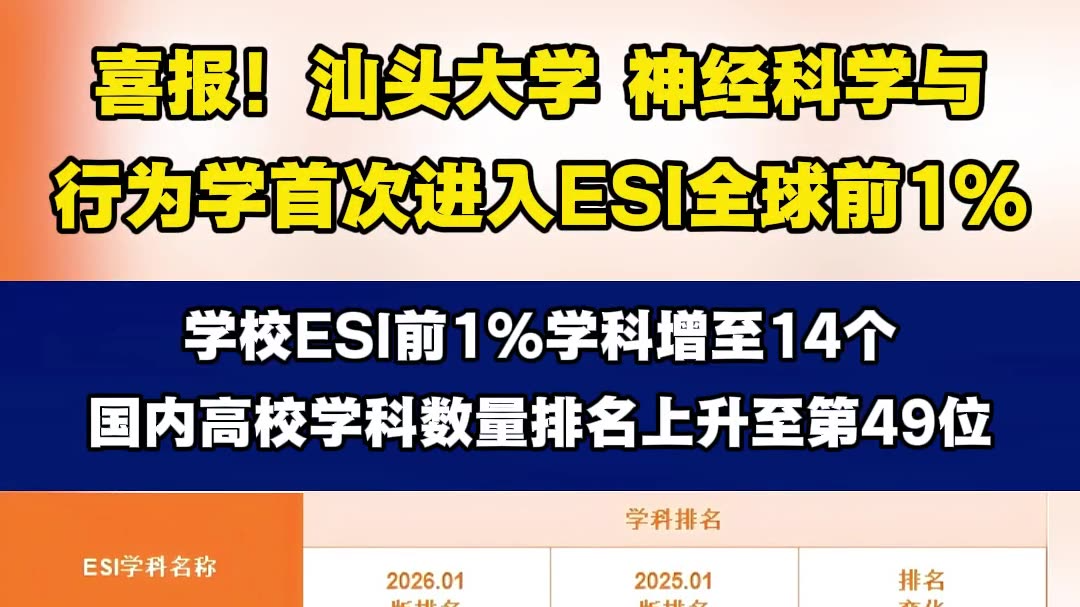 排名整体跃升!汕头大学ESI前1%学科总数增至14个