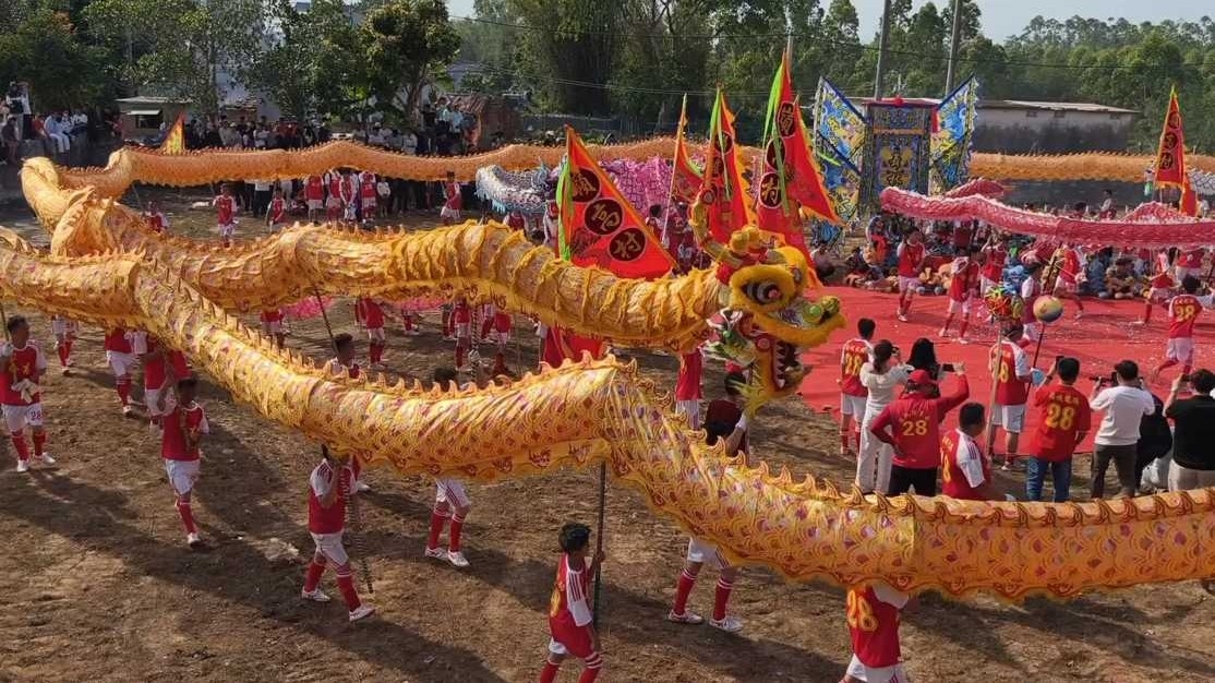 农历正月廿八,广东雷州市南兴东市四境岭高村黄金巨龙现身。