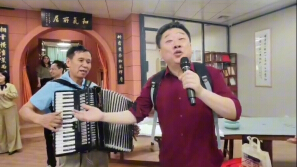 《游击队之歌》演唱广州梦骑队。手风琴伴奏王建中