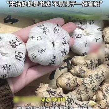 女子在葱姜蒜上练书法:生活处处是书法